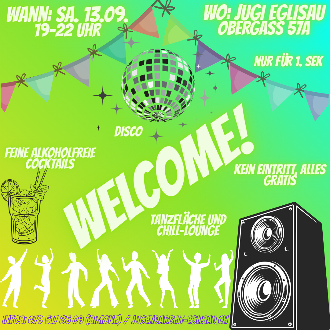 Alle, die neu in der 1. Oberstufe (egal ob an der Sek Eglisau oder an einer anderen Schule) sind, sind eingeladen zur Welcome-Party am Samstag, 13. September, von 19 bis 22 Uhr. Wir feiern mit euch, dass ihr ab den Sommerferien neu die Abend-Angebote im Treff nutzen dürft! An der Party gibt’s Musik nach eurem Geschmack, Tanzfläche, Snacks, feine Cocktails (alkoholfrei natürlich) und eine gemütliche Chillout-Lounge. Freier Eintritt, ohne Anmeldung.